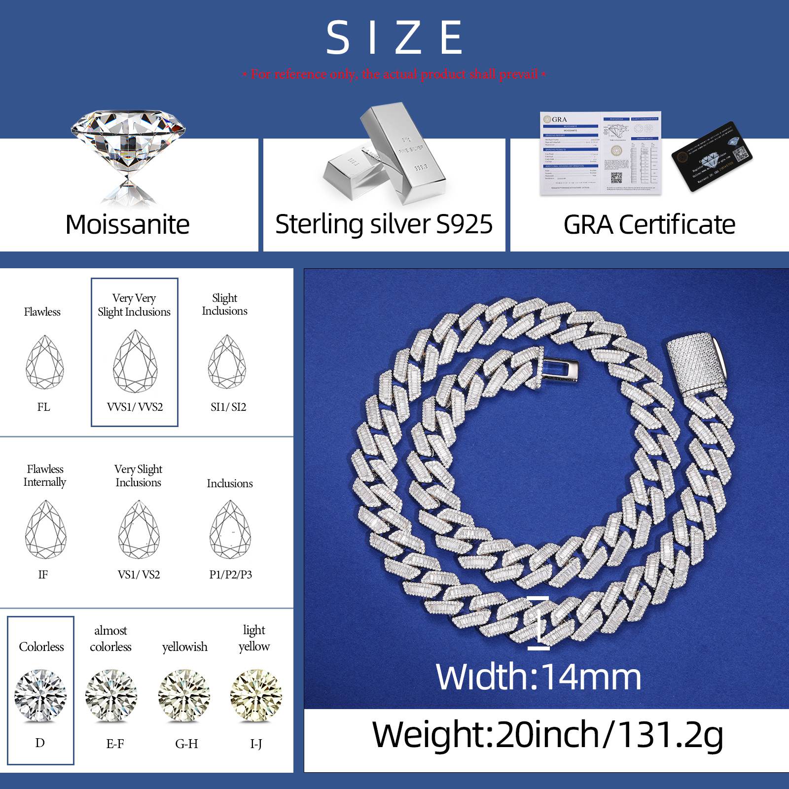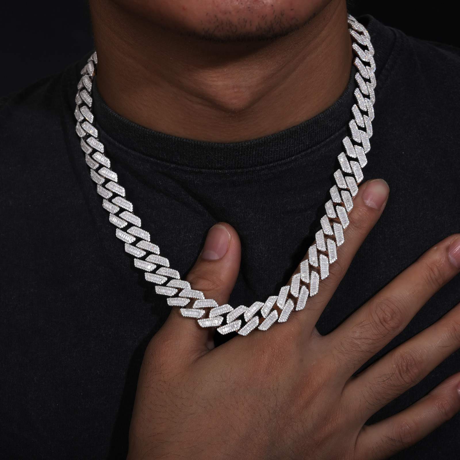 Baguette brilliance meets street royalty.This 14mm Cuban link chain rocks emerald-cut baguette D Color VVS moissanites set in premium 925... Read more
